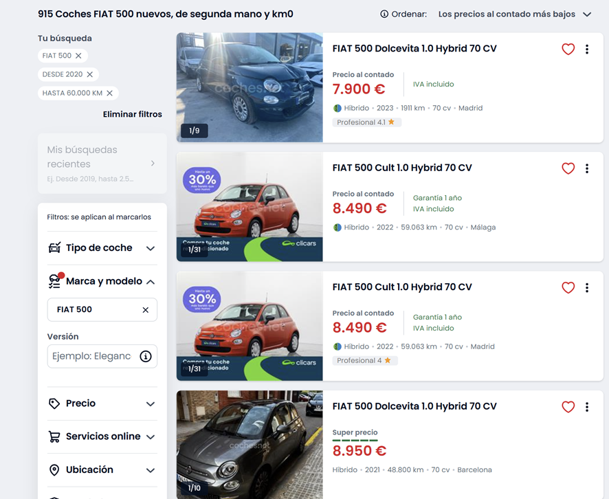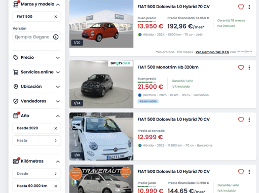 • Ejemplo real: buscamos un Fiat 500 híbrido desde 2020 con menos de 60.000 km.